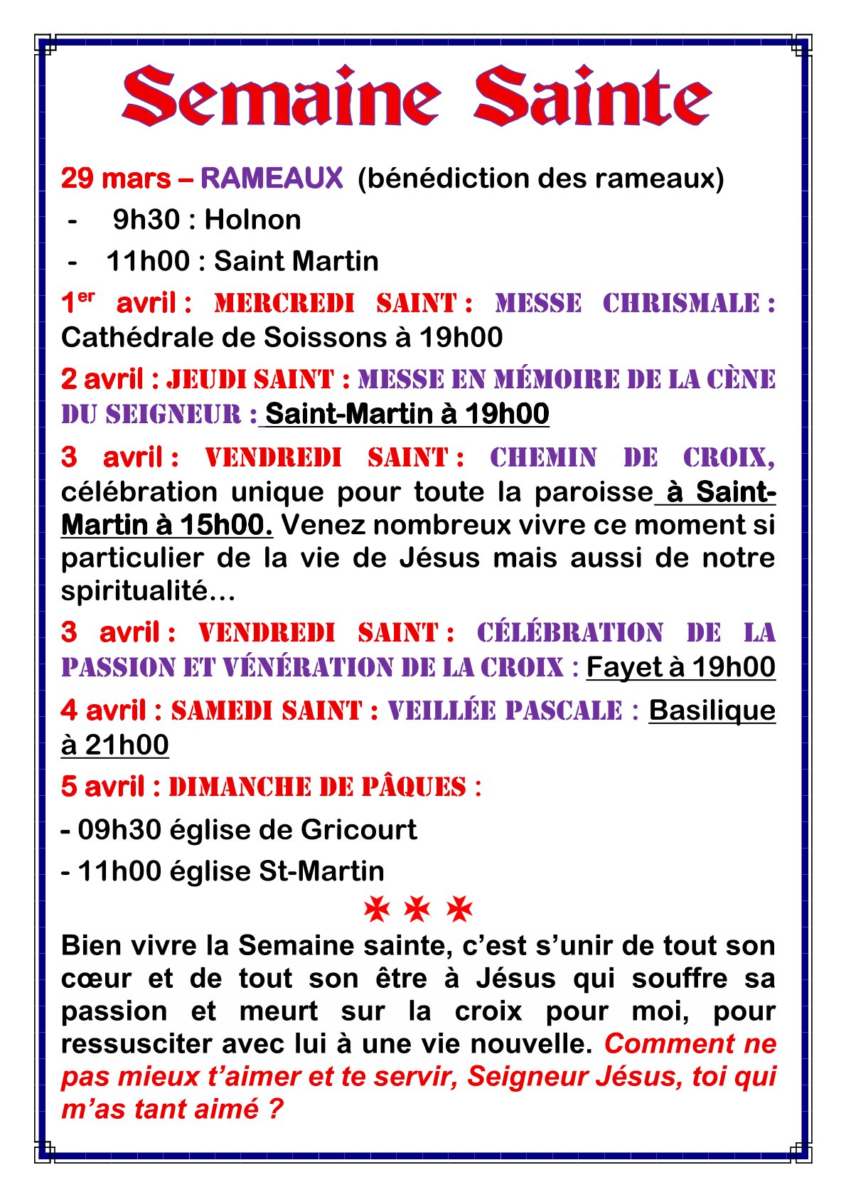 Bien vivre la Semaine Sainte, c’est s’unir de tout son cœur et de tout son être à Jésus qui souffre sa passion et meurt sur la croix pour moi, pour ressusciter avec lui à une vie nouvelle.